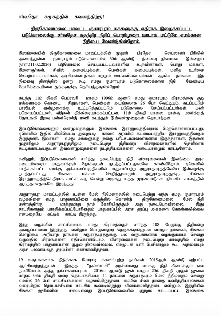 குமாரபுரம் கிராமத்தில் 11.02.1996 அன்று இடம்பெற்ற படுகொலையில் உயிரிழந்த 26 பேரின் 30ஆம் ஆண்டு நினைவேந்தல் நிகழ்வு, நேற்றைய தினம் (11.02.2026) காலை 10.00 மணிக்கு குமாரபுரத்தில் அமைக்கப்பட்ட நினைவேந்தல் மண்டபத்தில் நடைபெற்றது.