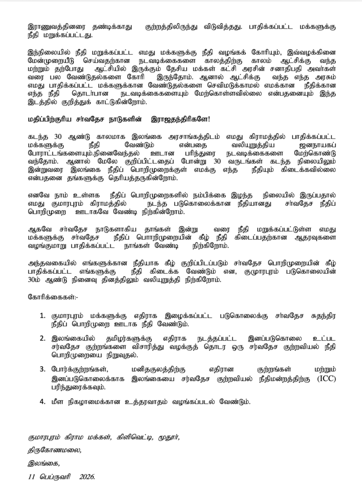 மேலும், “உள்ளக நீதிப் பொறிமுறையில் எங்களுக்கு நம்பிக்கை இல்லை; சர்வதேச நீதிப் பொறிமுறை ஊடாகவே குமாரபுரம் படுகொலைக்கு நீதி கிடைக்க வேண்டும்” என வலியுறுத்தி, சர்வதேச நாடுகளுக்கு மகஜர் ஒன்றும் அனுப்பி வைக்கப்பட்டது.