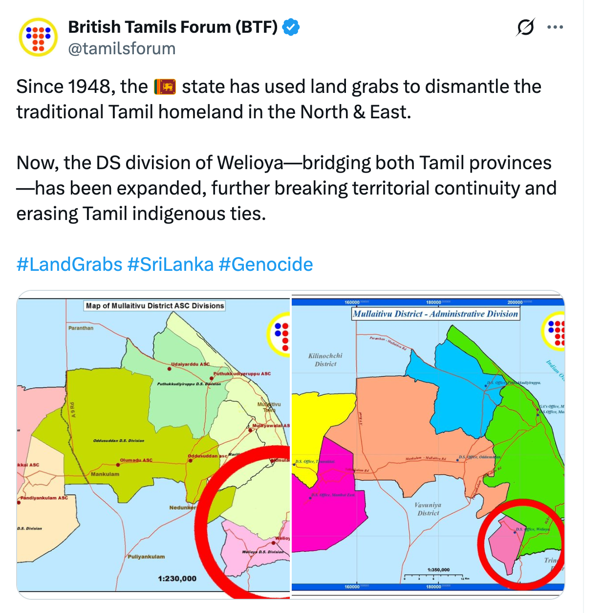 1948ம் ஆண்டு எனப்படும் சுதந்திரத்திலிருந்து இன்று வரை, இலங்கை அரசம் திட்டமிட்டு மேற்கொண்டுவரும் நில அபகரிப்புகள், தமிழர் பூர்வீக நில உரிமையை அழிக்கும் ஒரு அரச உத்தியோகபூர்வ ஆயுதமாகவே செயல்பட்டுள்ளது. என பிரித்தானிய தமிழர் பேரவையின் சமூக வலைத்தளத்தில் பிரசுரமாகியுள்ளது